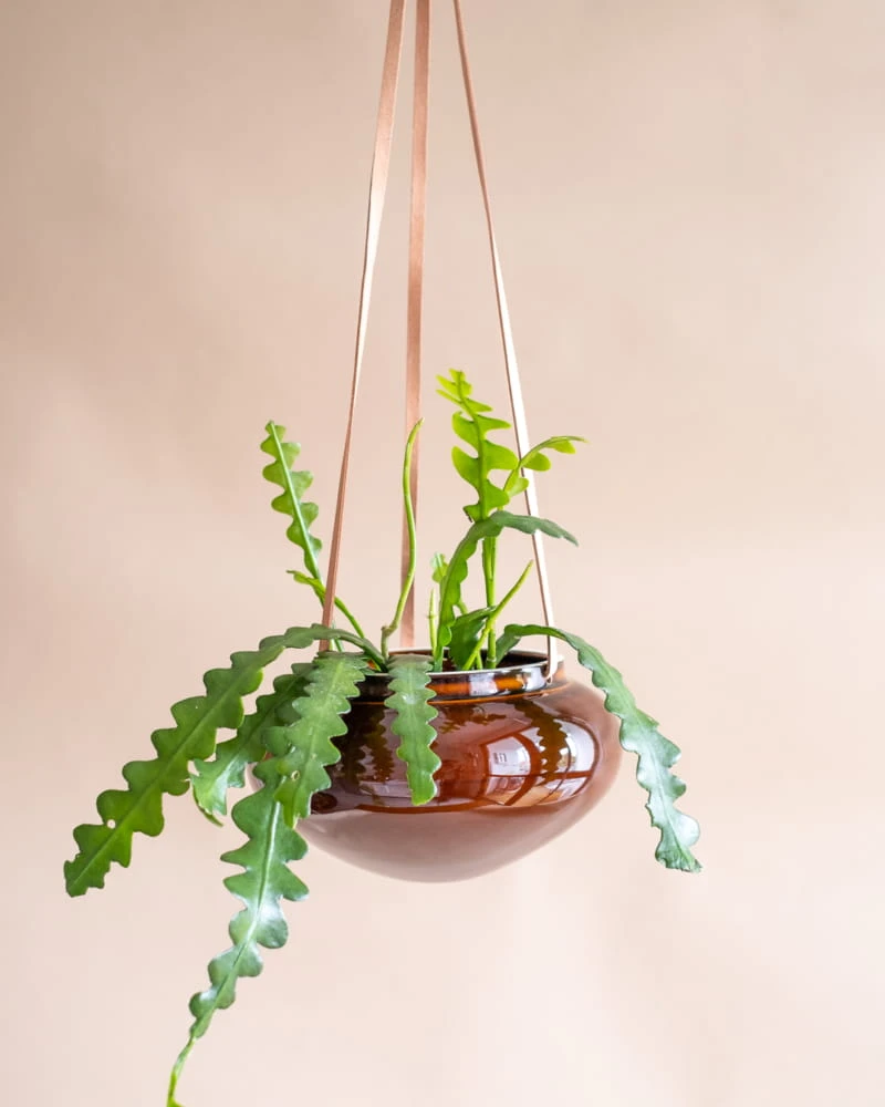 Ceramiczna osłonka na doniczkę Oval miodowa na rzemyku polskiej marki Formy Proste to wspaniała dekoracja dla Twojej roślinki. Włóż doń swój ulubiony kwiat i zawieś w salonie lub w sypialni. Osłonka ceramiczna wykonana na wysoki połysk, szkliwiona. Dzięki dołączonemu skórzanemu rzemykowi, zawiesisz ją u sufitu w wybranym pomieszczeniu.Ceramiczna doniczka szkliwiona może stanąć w sypialni lub salonie, a w niej mniejsza roślinka, np. starzec lub jakiś sukulent. Ten kolor piękne eksponuje zielone liście i kwitnące pąki. Stwórz całą kolekcję!Kilka sztuk zawieszonych obok siebie będzie wyjątkową zieloną instalacją. Są to osłonki ręcznie robione, więc pamiętaj, że dwie sztuki nigdy nie będą jak wycięte z szablonu. My jesteśmy zakochani od pierwszego spojrzenia!