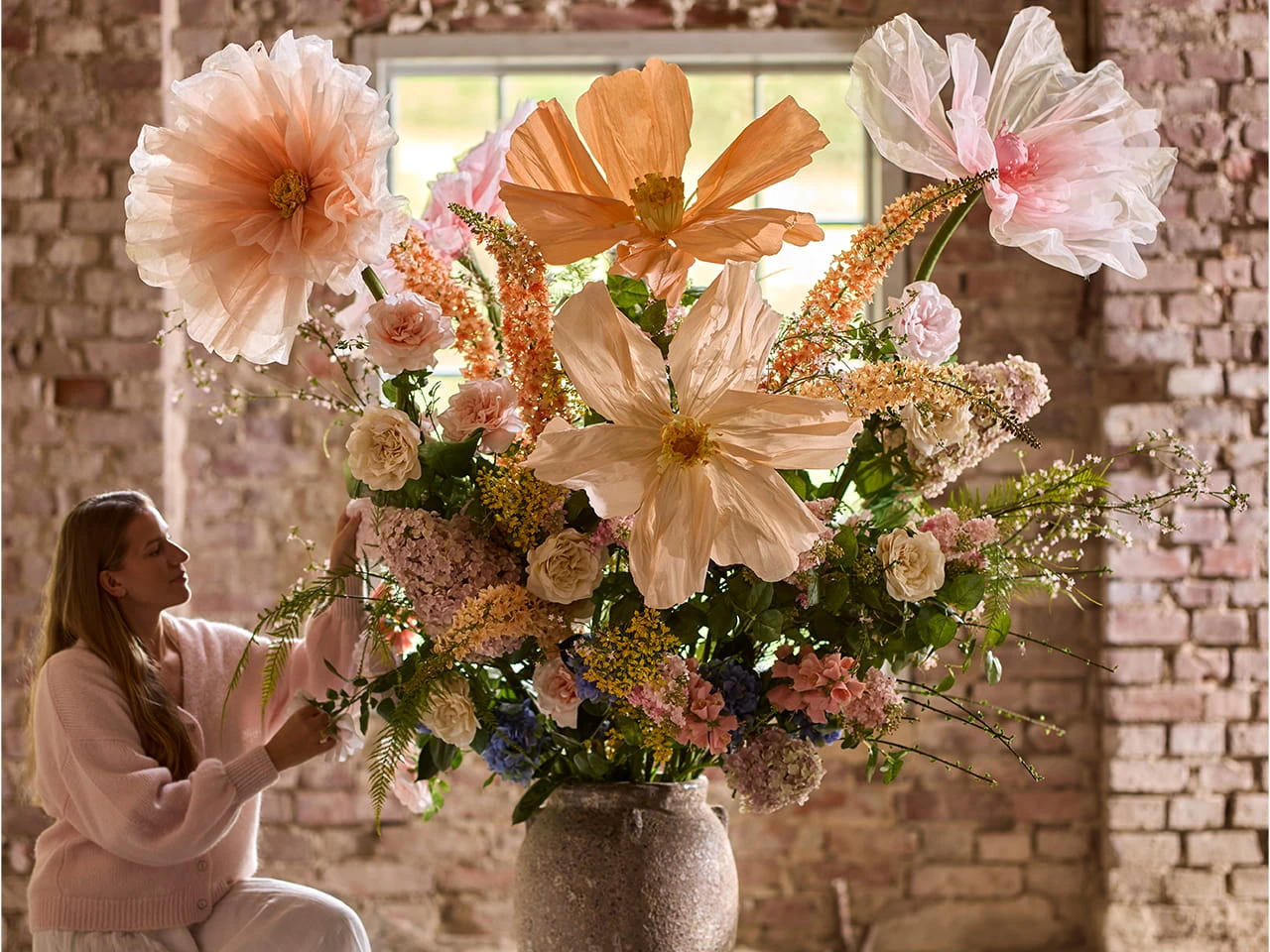 Mr Plant -trzy duże kwiaty dekoracyjne w brzoskwiniowym kolorze
