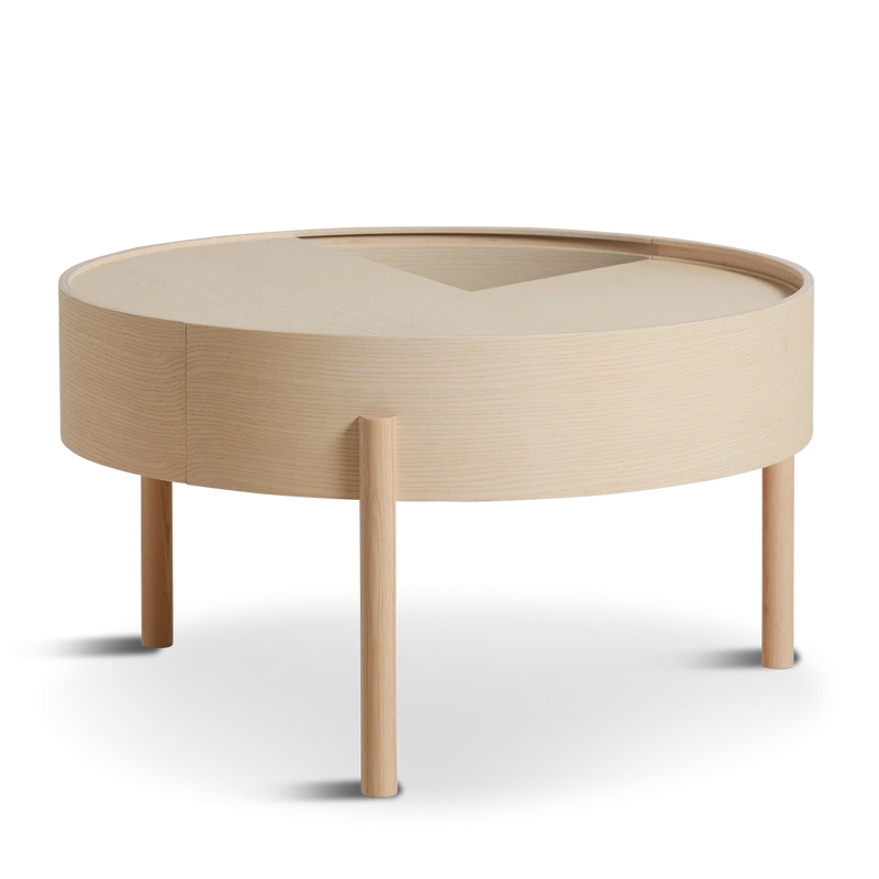Stolik kawowy ARC nazwę czerpie z matematycznych funkcji opisujących właściwości okręgu. Projektanci tych pomysłowych stolików kawowych postawili na interakcję między przedmiotem a użytkownikiem oraz na dbałość o każdy detal. Stolik kawowy jest zaprojektowany tak, aby użytkownik mógł z łatwością obracać górny blat jednym palcem. Można go otworzyć, aby wyeksponować ulubione przedmioty, lub zamknąć, aby ukryć nieporządek. Wewnętrzna przestrzeń do przechowywania jest pokryta gładkim nanolaminatem, który doskonale komponuje się z drewnem jesionowym. Trójnoga konstrukcja dodaje lekkości i geometrycznego uroku całemu projektowi. Stolik ARC to nie tylko praktyczny mebel, ale także stylowy dodatek do każdego wnętrza. Ten wyjątkowy mebel, który doskonale wpisuje się w skandynawski styl. Jego prosta, ale elegancka forma sprawia, że pasuje do minimalistycznych wnętrz, dodając im uroku i wyrafinowania. Wykonany z najwyższą precyzją i dbałością o detale, stolik ARC jest nie tylko praktyczny, ale także estetyczny. Jego blat jest idealny do serwowania kawy czy herbaty, a także jako miejsce na ulubione książki czy dekoracje. Solidna konstrukcja gwarantuje trwałość i stabilność, a naturalne wykończenie podkreśla piękno drewna. Stolik ARC to doskonały wybór dla osób ceniących sobie prostotę i funkcjonalność połączoną z nowoczesnym designem
