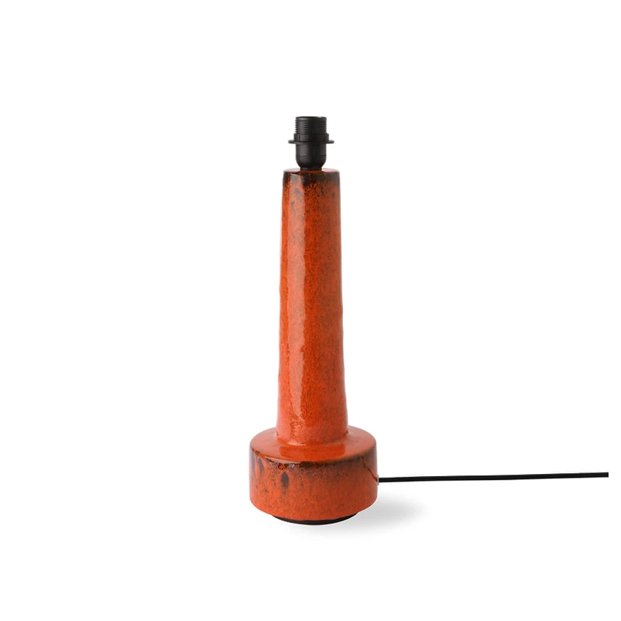 Czerwona lampa retro z kamionki, ręcznie glazurowana lawową powłoką. Elegancka baza z ceramicznym stoneware, kompatybilna z żarówkami E27 do 60W. Wymiary 15x15x48 cm, minimalistyczny design.