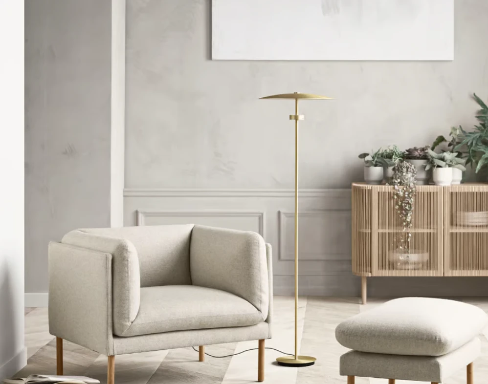 Złota lampa stojąca LED Reflection to dzieło, które duńska marka Bolia stworzyła w kooperacji z polską firmą. Skandynawske pomysł i design spotkały się z dłońmi naszych rzemieślników. W cieniu tej lampy podłogowej odkryjesz przestrzeń, gdzie światło staje się refleksją duszy i romantyczną opowieścią. Jej parasolowy kształt to niczym ochronna dłoń, która delikatnie ukierunkowuje światło, jakby skupiając na Twojej wewnętrznej podróży. To magiczne źródło inspiracji, które rozświetla zarówno przestrzeń, jak i Twoje myśli.