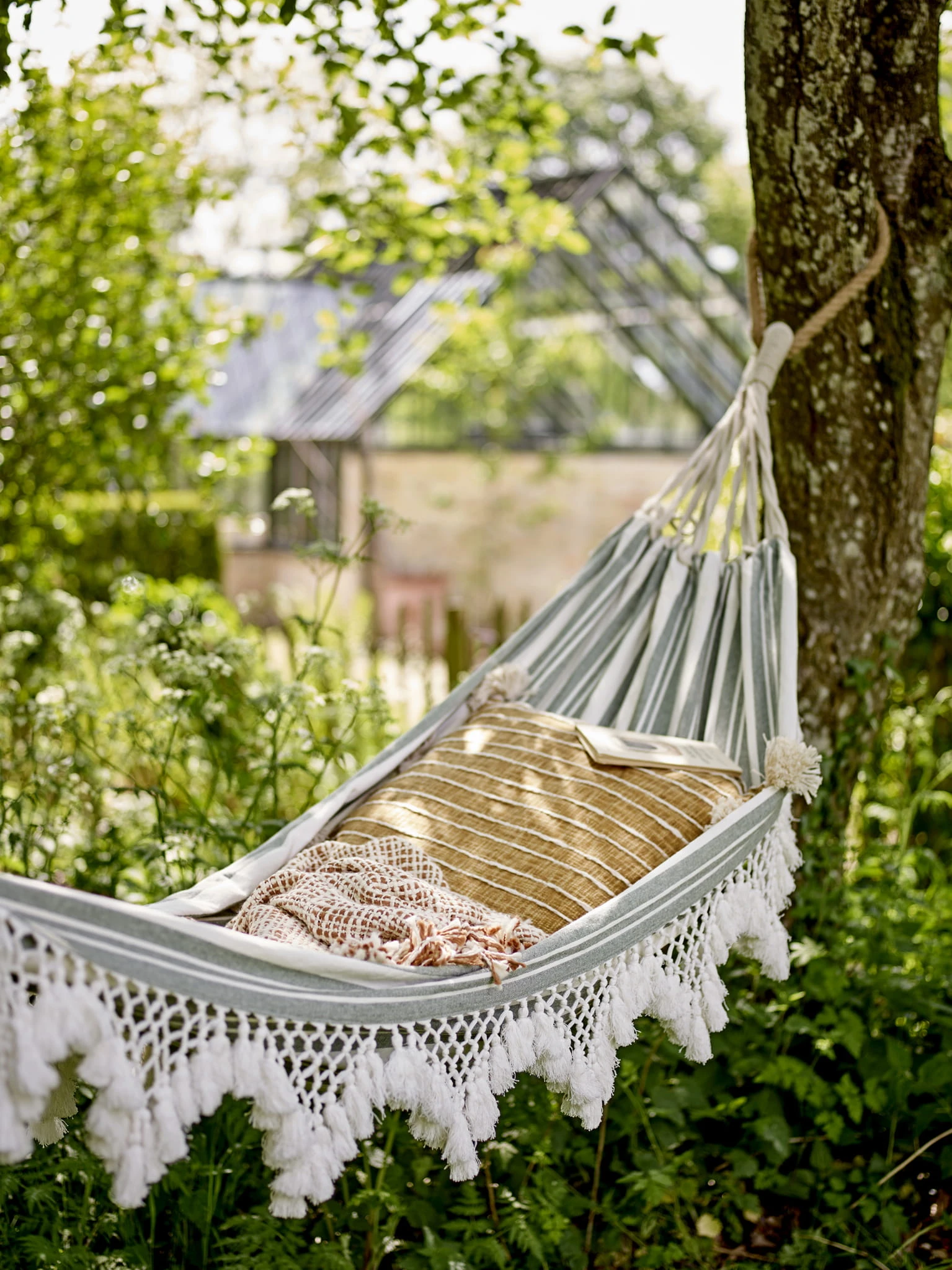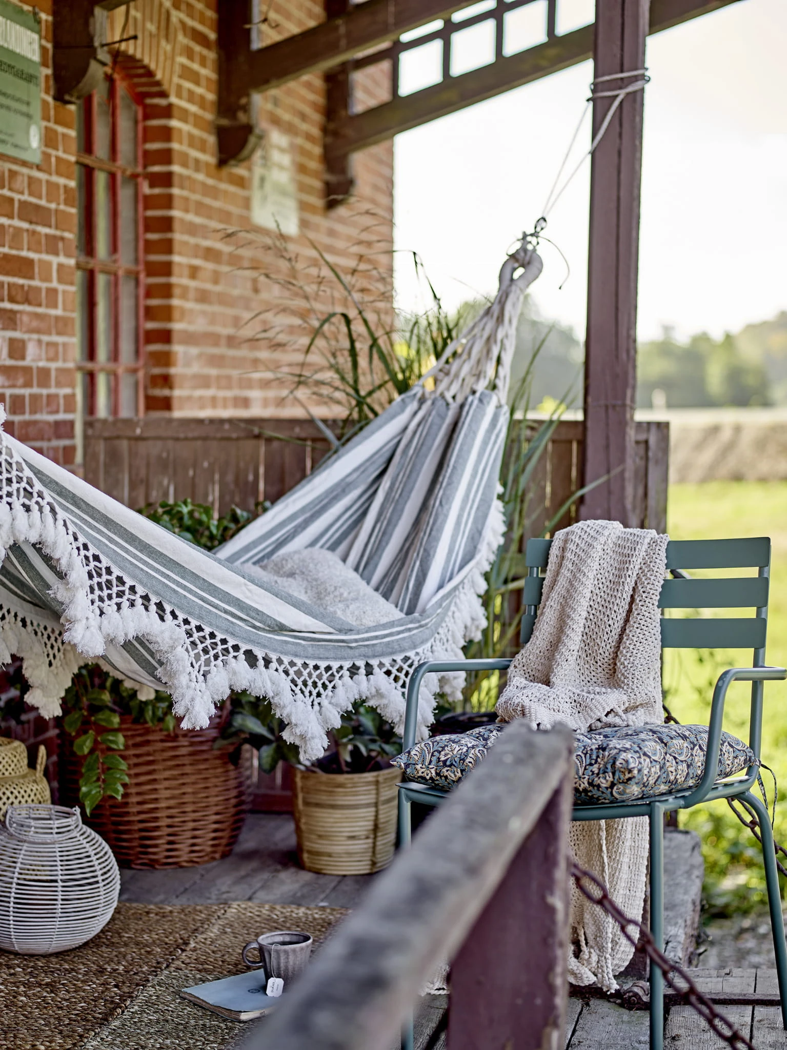 Hamak Cruz od Bloomingville to wygodny dodatek do ogrodu, idealny na letnie dni. Wykonany z miękkiej bawełny w zielonym odcieniu, ozdobiony jest subtelnymi detalami po bokach.