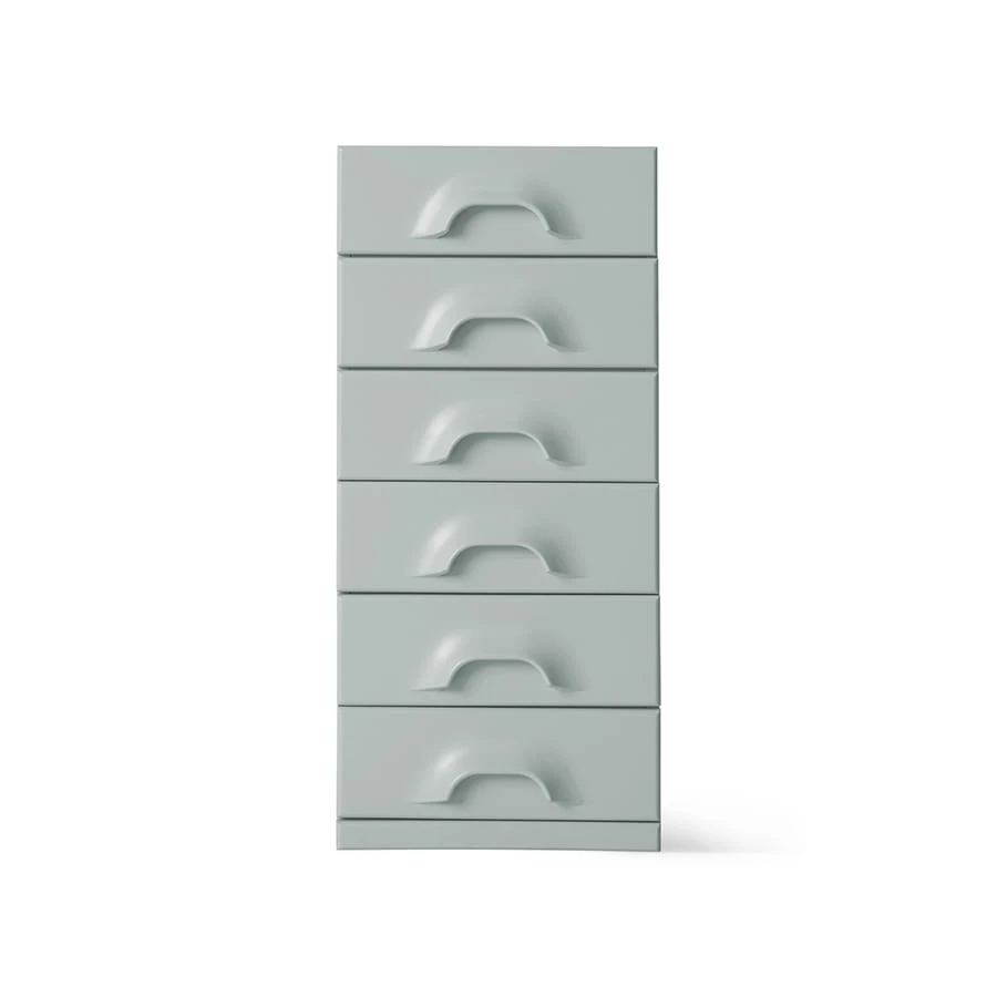 Elegancka komoda z 6 przestronnymi szufladami w stylowym odcieniu jasno niebieskim. Wykonana z trwałego MDF, idealna do przechowywania. Wymiary: 45x40,5x97,5 cm.
