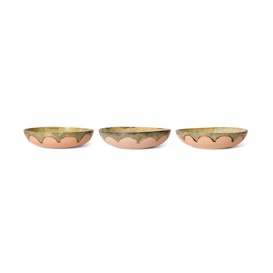 Wielokolorowa miska ceramiczna SUNFLOWER w stylu lat 70., wykonana z naturalnej kamionki. Surowa prostota, średnica 33 cm, wysokość 8 cm, waga 1.97 kg. Idealna do sałatek, inspirowana retro designem.