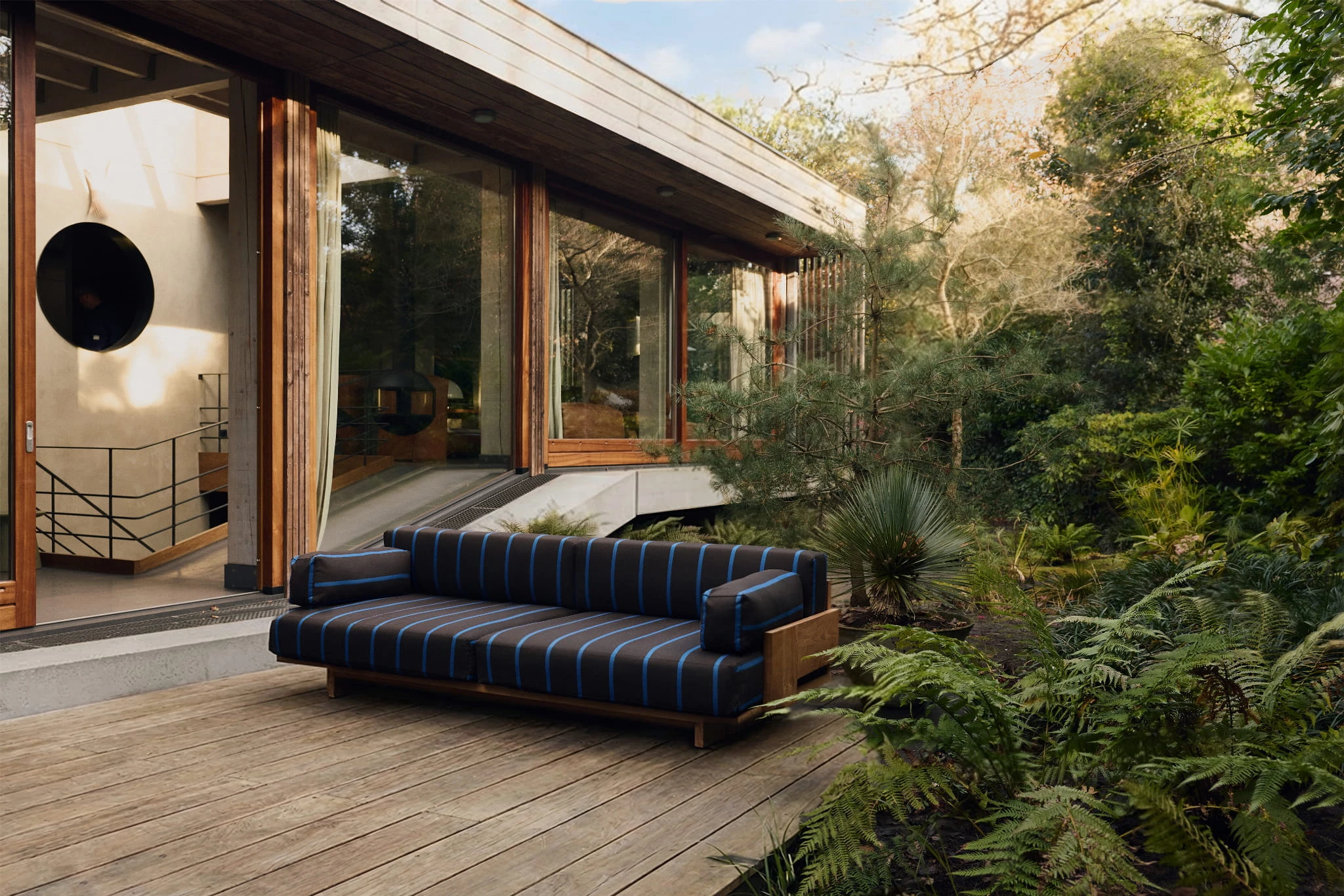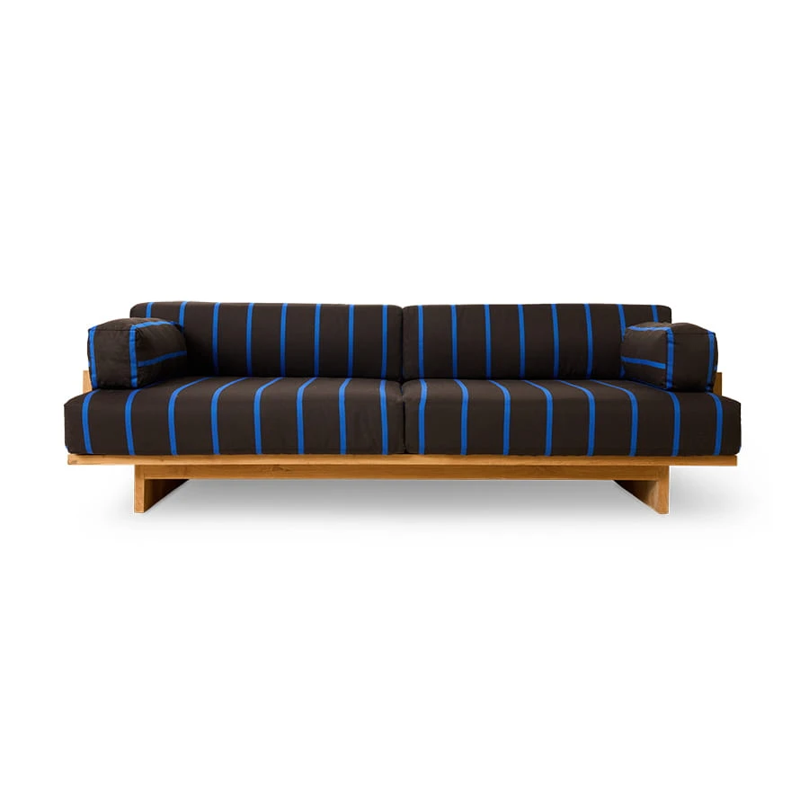 Sofa outdoor wykonana z drewna tekowego w subtelnymi niebiskimi paskami to połączenie elegancji, trwałości i komfortu. Idealnie sprawdzi się w ogrodach, na tarasach czy balkonach, tworząc przytulną przestrzeń do relaksu na świeżym powietrzu