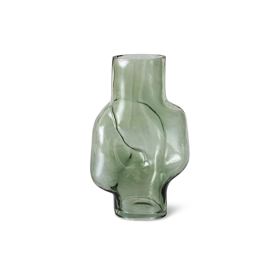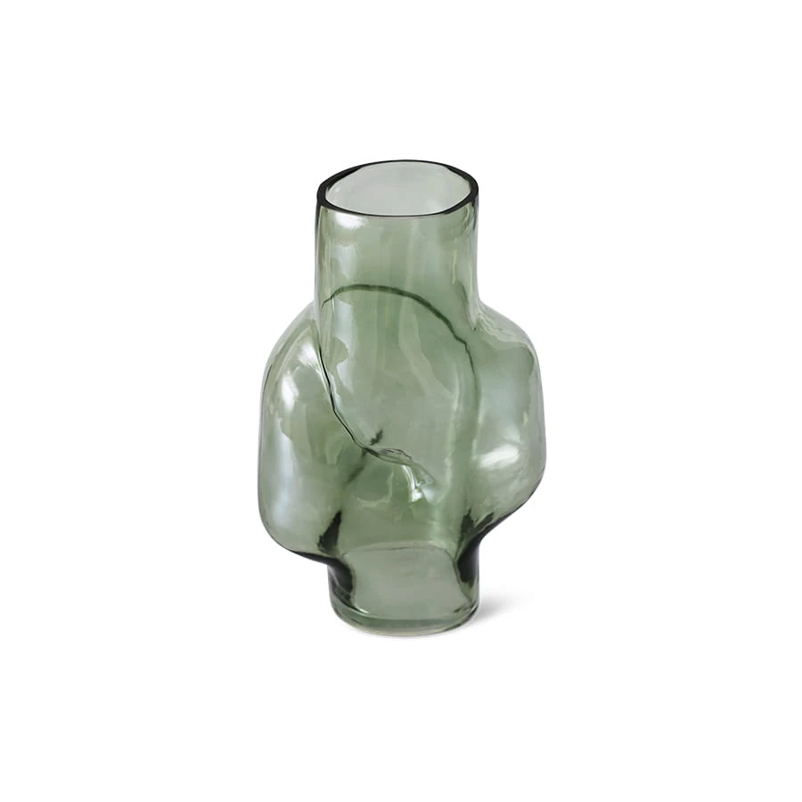 Wysoki wazon GLEAM hkliving w organicznym kształcie i oliwkowej zieleni. Płynna forma, nowoczesne wykończenie ze szkła, wymiary 15x20x32 cm. Elegancka dekoracja wnętrz.