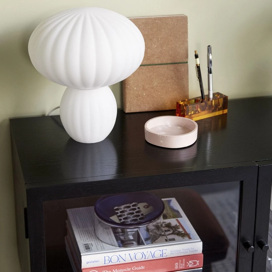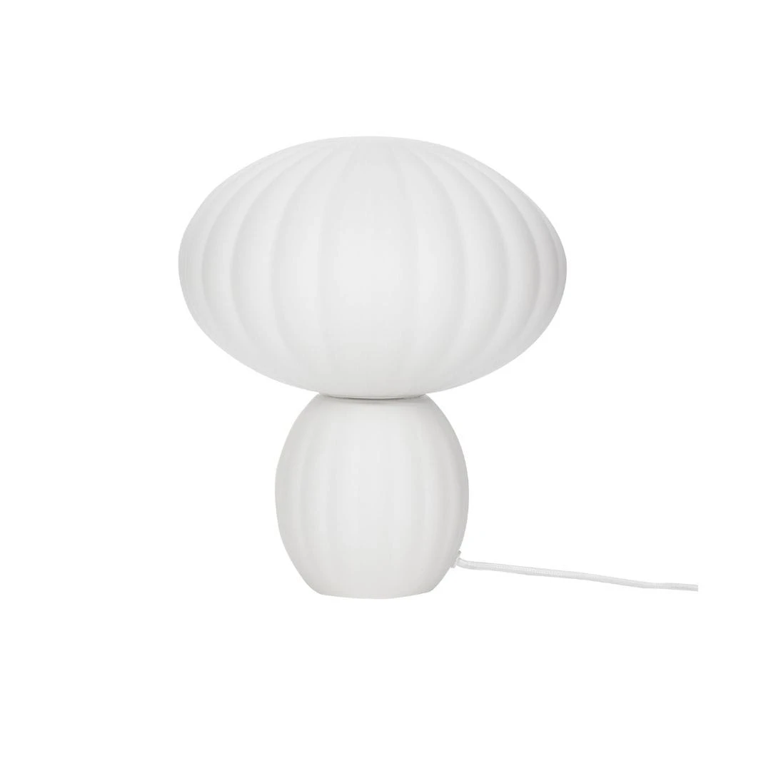 Biała stylowa lampa stołowa Kumu Hubsch to piękna i - można rzecz - kobieca propozycja od duńskiej marki. Forma zdecydowanie pasuje do damskiej sypialni, garderoby czy salonu urządzanego kobiecą ręką. Biała lampa Kumu wykonana jest ze szkła. Pionowe żłobienia sprawiają, że przybiera look trochę jakby sukni balowej. Wyjątkowa dekoracja, a przy tym praktyczny element przestrzeni. Lampa wykonana jest ręcznie, więc każdy egzemplarz jest unikalny.