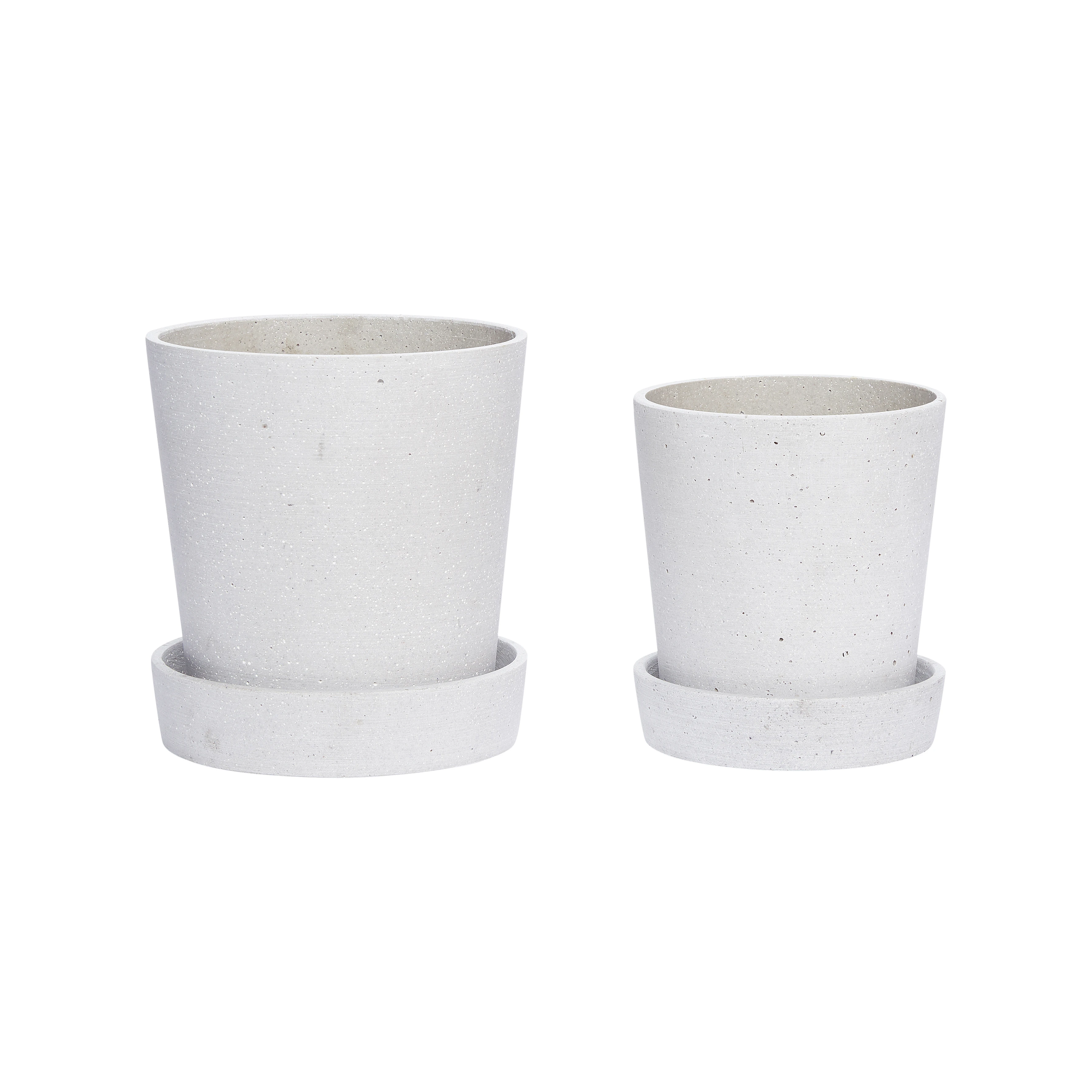 Zestaw dwóch doniczek z firmy HUBSCH robionych ręcznie, wykonane z lekkiego materiału polystone, który posiada naturalną lekko chropowatą powierzchnię podobną do powierzchni kamienia.
