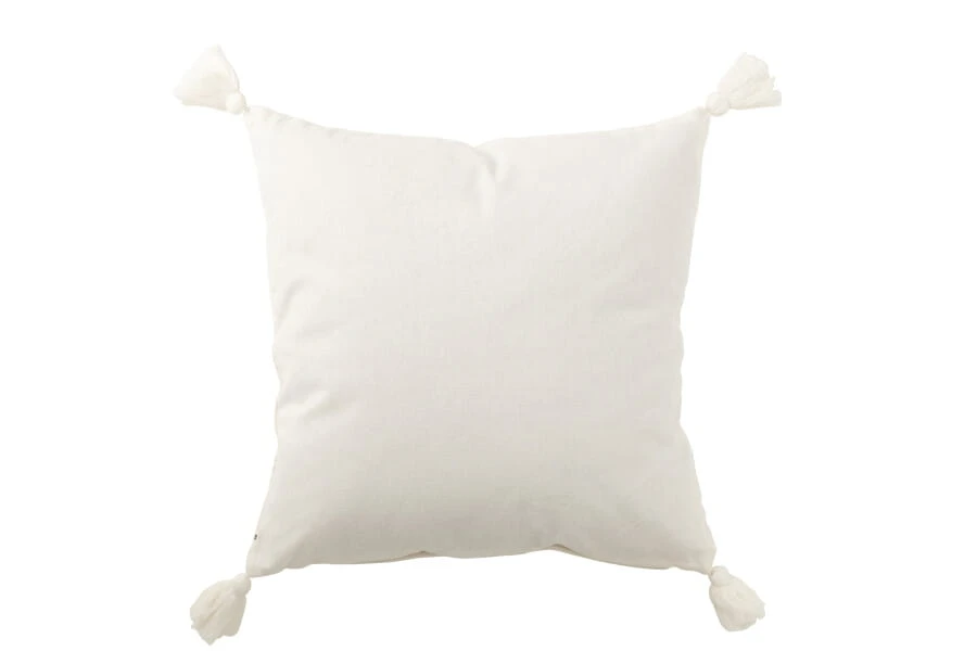 Biała poduszka dekoracyjna z frędzlami Lene Bjerre może posłużyć tylko jako ozdoba salonu lub pokoju, a można wykorzystać ją także do wygodnego podparcia pleców i siedzenia na podłodze. Duża, solidna, estetycznie uszyta. Frędzle umieszczone w rogach sprawiają, że jest ciekawa, inna niż typowe poduchy. Każdy egzemplarz dekorowany jest ręcznie. W skład serii wchodzi kilka rodzajów poduch, w różnych pastelowych kolorach.