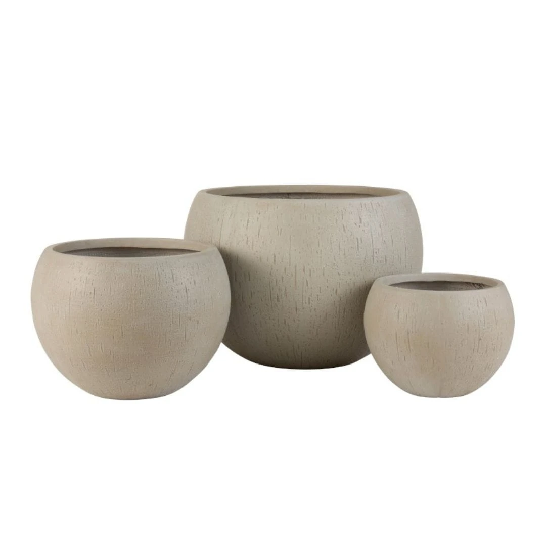 Donice wykonane są z ceramiki w beżowym kolorze. Kształtem przypominają otwartą u góry kulę, dodatkowo ozdobioną żłobieniami, jakby lekkimi pęknięciami. Nadaje to wazonom niepowtarzalny styl