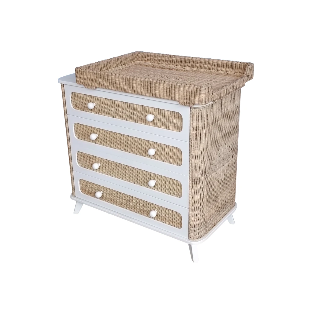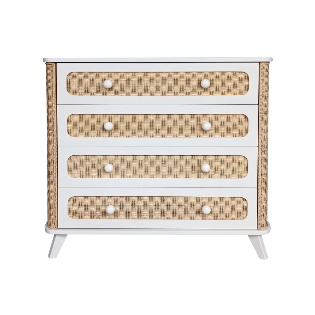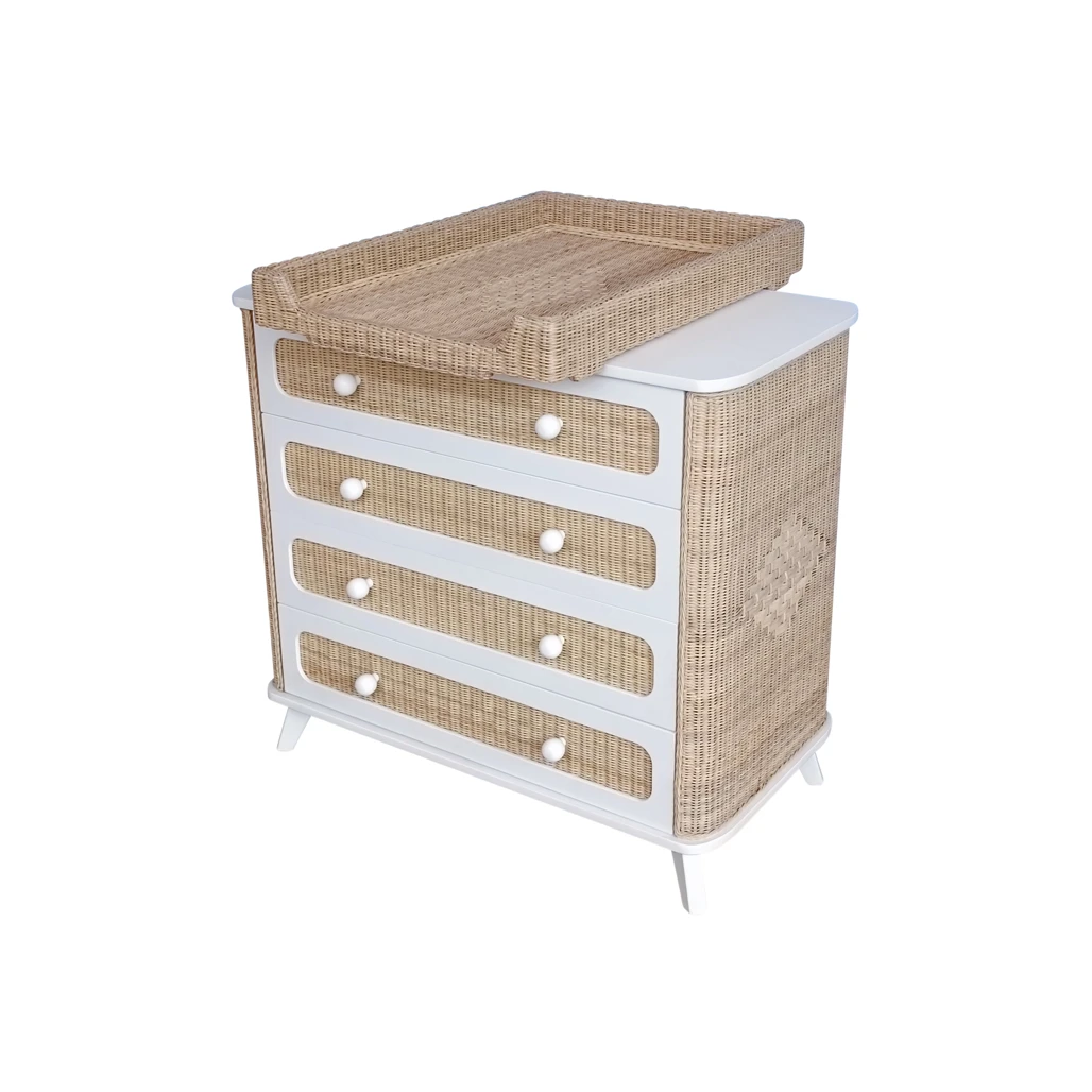 Komoda COQUILLAGE doskonale uzupełnia łóżeczka COQUILLAGE w rozmiarach 60x120 cm i 70x140 cm. Jej ręcznie plecione panele rattanowe, ozdobione dekoracyjnymi detalami po bokach, przenoszą myślami w podróż między Oceanem Indyjskim a Pacyfikiem. Posiada 4 pojemne szuflady z systemem cichego domyku.