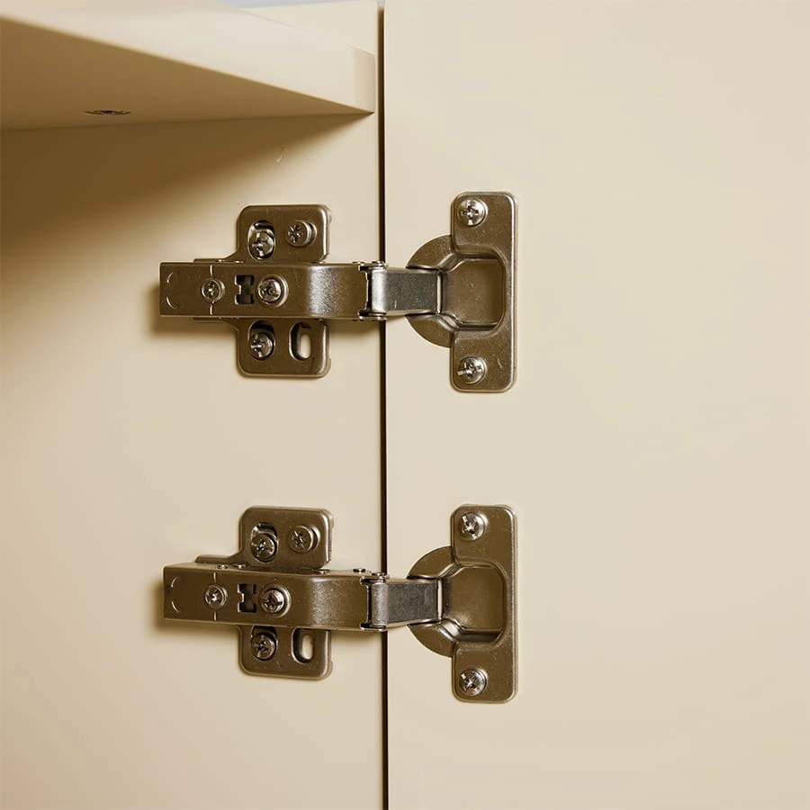 Elegancki kredens w kremowym odcieniu o wymiarach 80x40x89 cm, wykonany z trwałego MDF i metalu, z połyskującą powierzchnią, idealny do nowoczesnych wnętrz.