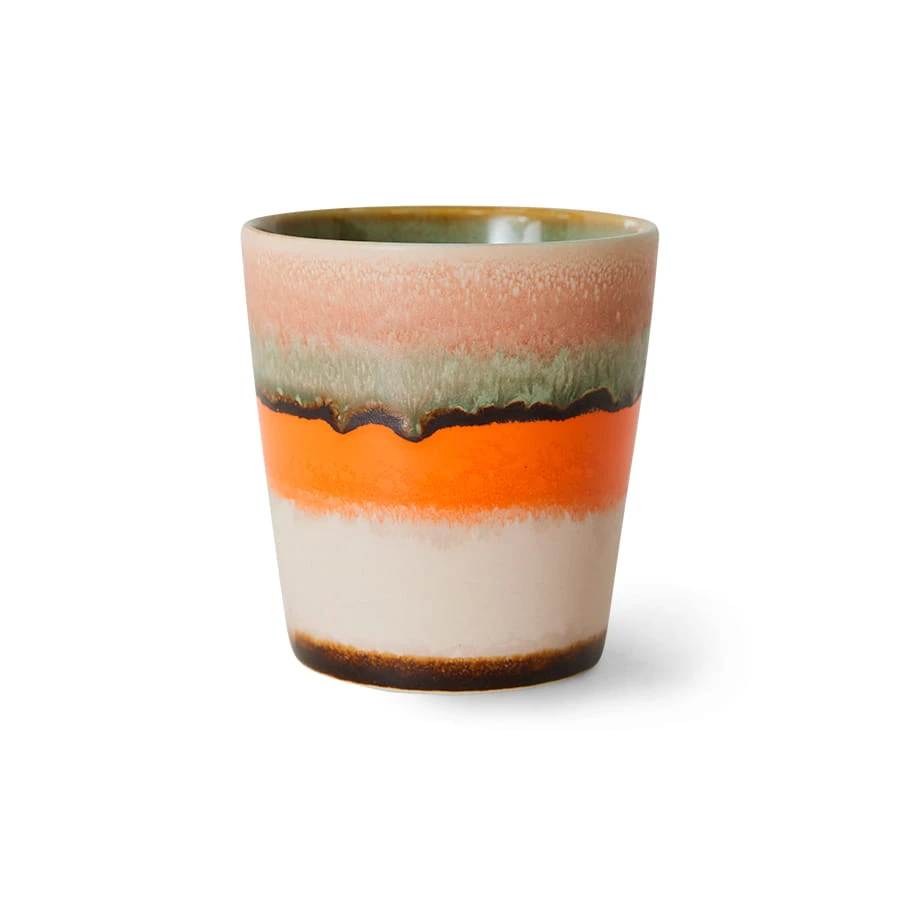 Retro kubek ceramiczny 70s w stylu burst, 180ml. Ręcznie wykończony, z unikalnym wzorem i ziemistymi kolorami. Kamionka pokryta szkliwem reaktywnym, bezpieczna w mikrofalówce i zmywarce. Naturalny, designerski dodatek.