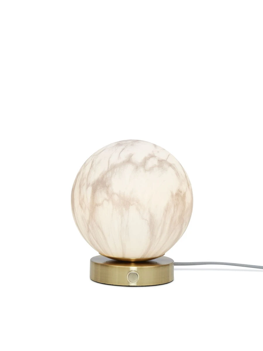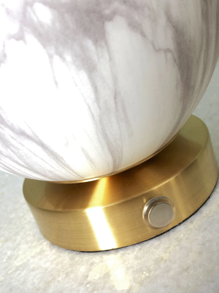 Lampa stołowa CARRARA to wyjątkowy dodatek do każdego wnętrza. Wykonana z metalu i szkła, posiada mleczny klosz, który nadaje jej niepowtarzalnego charakteru. Wzór marmuru na podstawie lampy, w połączeniu z złotym kolorem, tworzy elegancką i ponadczasową kompozycję. Lampa idealnie sprawdzi się w sypialni, dodając jej ciepła i przytulności. Włącznik umieszczony jest na podstawie lampy, co jest niezwykle praktyczne i wygodne w użytkowaniu. Długość kabla wynosi 180 cm, a jego kolor to tekstura szara. Źródło światła to żarówka E 14 o mocy 25W. Wymiary lampy to: średnica 16 cm, wysokość 18 cm. Waga lampy wynosi 0.9 kg, a wymiary opakowania to 34x21x21 cm. Abażur ma średnicę 16 cm. Lampa CARRARA to połączenie funkcjonalności i stylowego designu