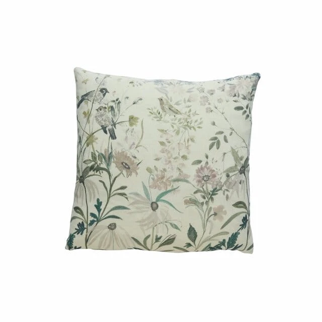 Ta elegancka poszewka dekoracyjna to subtelna interpretacja natury zamknięta w wyjątkowej formie tekstylnej. Delikatny, botaniczny wzór z kwiatami i ptakami w stonowanych odcieniach zieleni, beżu i pudrowych pasteli tworzy harmonijną kompozycję, która wprowadza do wnętrza spokój, lekkość i ponadczasowy urok.