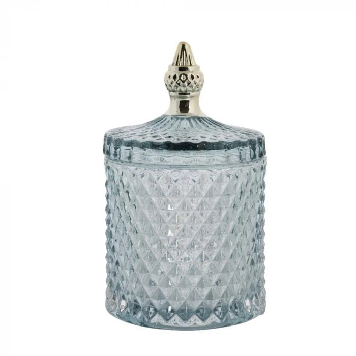 Miętowy pojemnik dekoracyjny Miya 17,5cm to szkatułka, którą wykorzystasz na biżuterię lub drobiazgi. Nasze Klientki chętnie ustawiają te modne słoiczki na toaletkach lub komodach w salonie. Szkło ma elegancką fakturę a'la kryształ. W skład całej serii wchodzi kilka kolorów pojemniczków, więc stwórz swój zestaw!