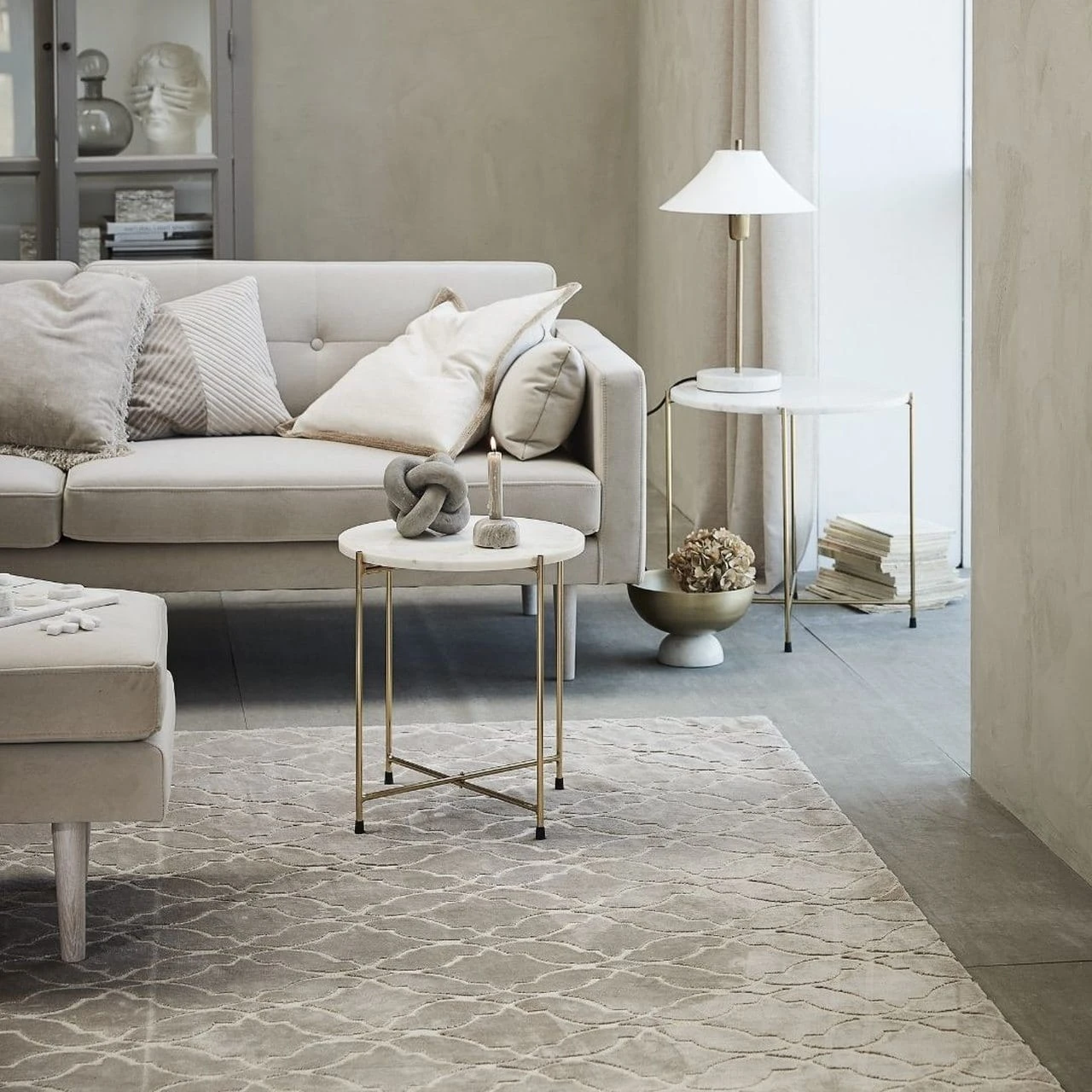 Zestaw dwóch złotych stolików z białym marmurowym blatem 45cm i 50cm Marmilla od marki Lene Bjerre możesz postawić w tej samej przestrzeni lub w dwóch zupełnie różnych. Oba stoliki mają złote stalowe nogi i biały marmurowy blat. Większy to może być Twój stolik kawowy, a mniejszy stolik nocny przy łóżku. Albo jeden to boczny stolik w salonie, a drugi to stolik do przedpokoju lub... podest dla kwiatka! Oh! W czasach, gdy wszyscy zapraszamy roślinność do swoich domów, hodujemy wyjątkowe okazy, które chcemy eksponować, taki stolik też może być miejsce do stworzenia kwietnej aranżacji. Postaw na nim wazon lub doniczkę. Białym marmurowy blat ma każdym egzemplarzu ma inny wzór - to zaleta naturalnego kamienia, czuli unikalność formy. Dwa stoliki w świetnej cenie! Polecamy!