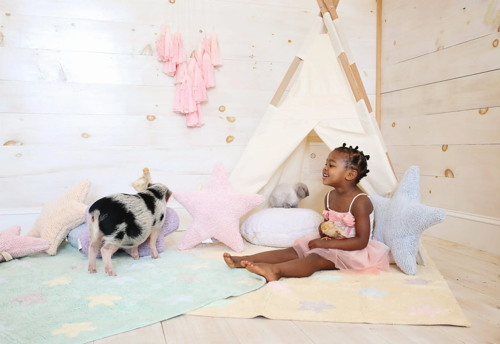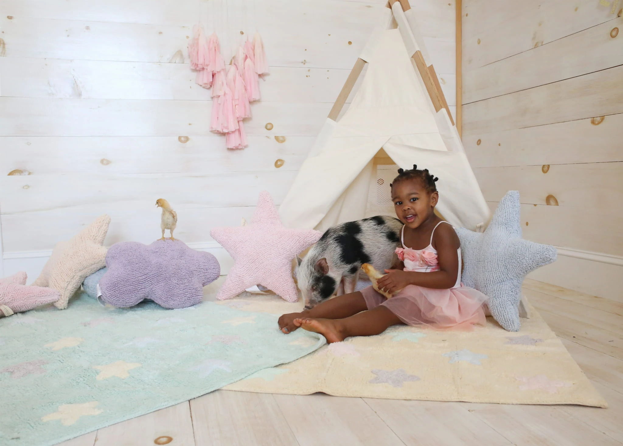 Ożyw swój dom niebieską poduszką dekoracyjną Estrella od Lorena Canals. Ta ręcznie robiona, ekologiczna gwiazda wnosi do wnętrza przytulność i magię, będąc miękką i bezpieczną ozdobą do salonu lub pokoju dziecka.