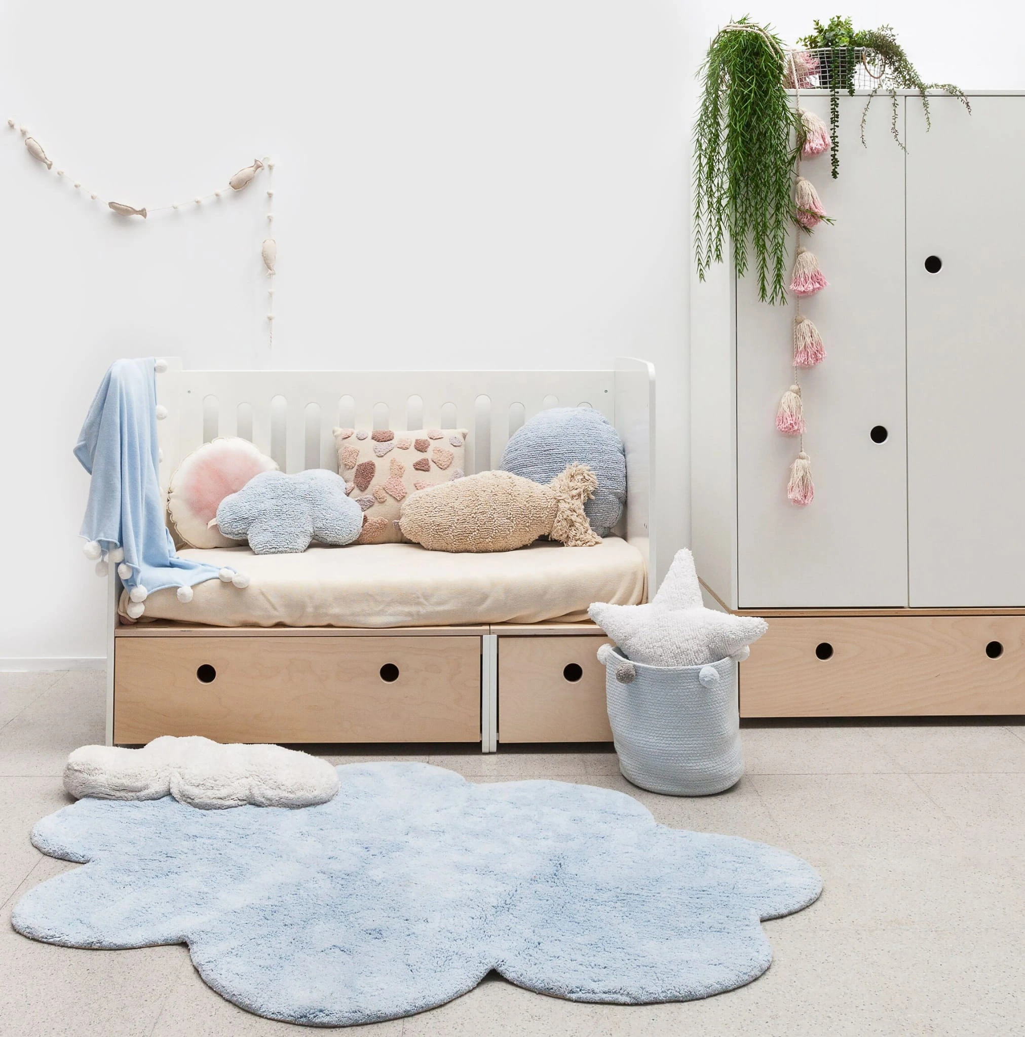 Niebieska poduszka dekoracyjna Lorena Canals CLOUDS w kształcie chmurki to ręcznie robiony, ekologiczny dodatek do pokoju dziecka, który wnosi magię i przytulność.