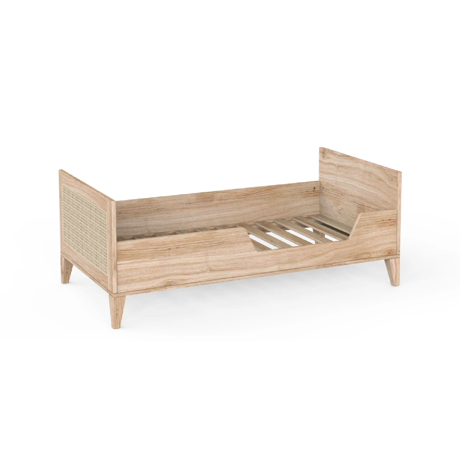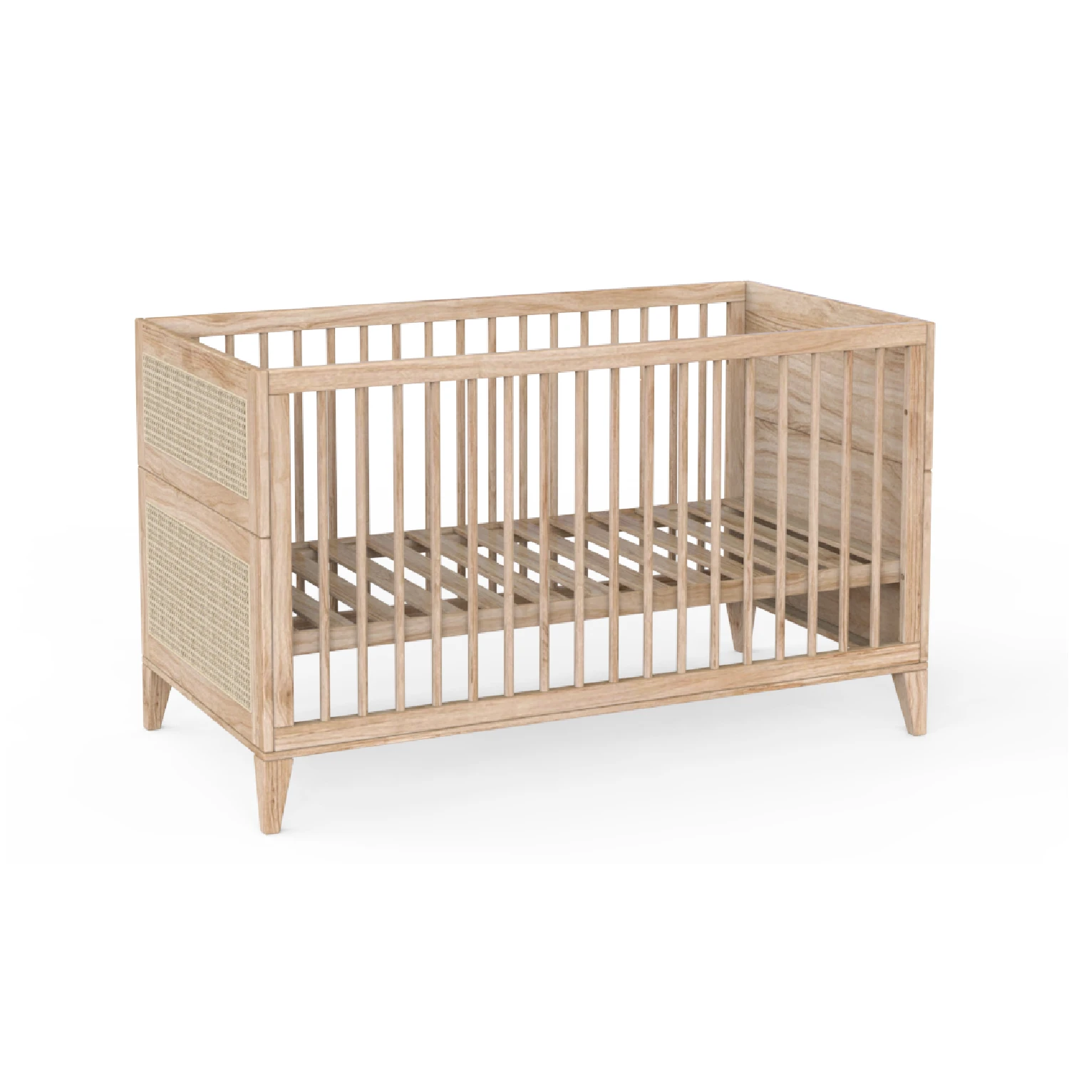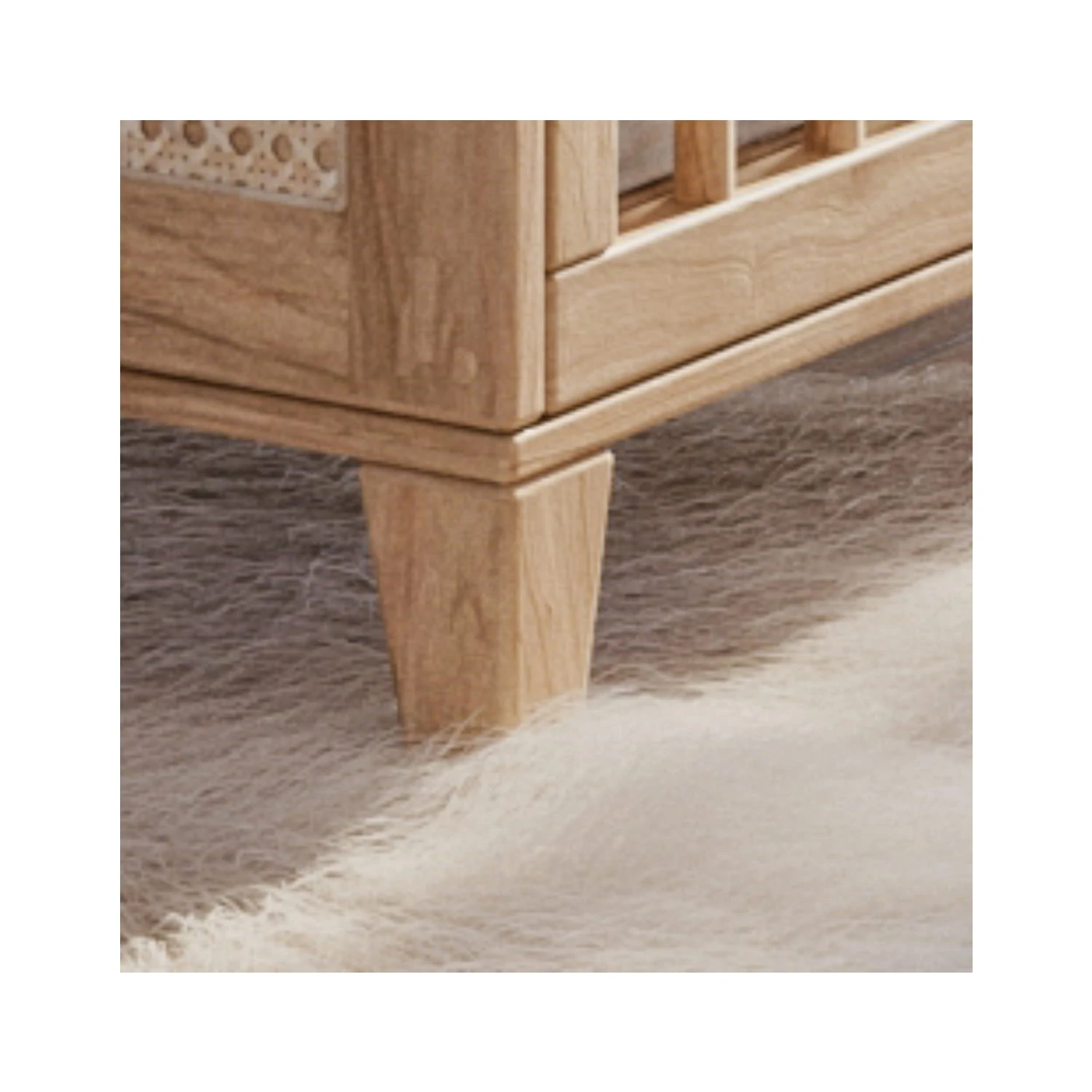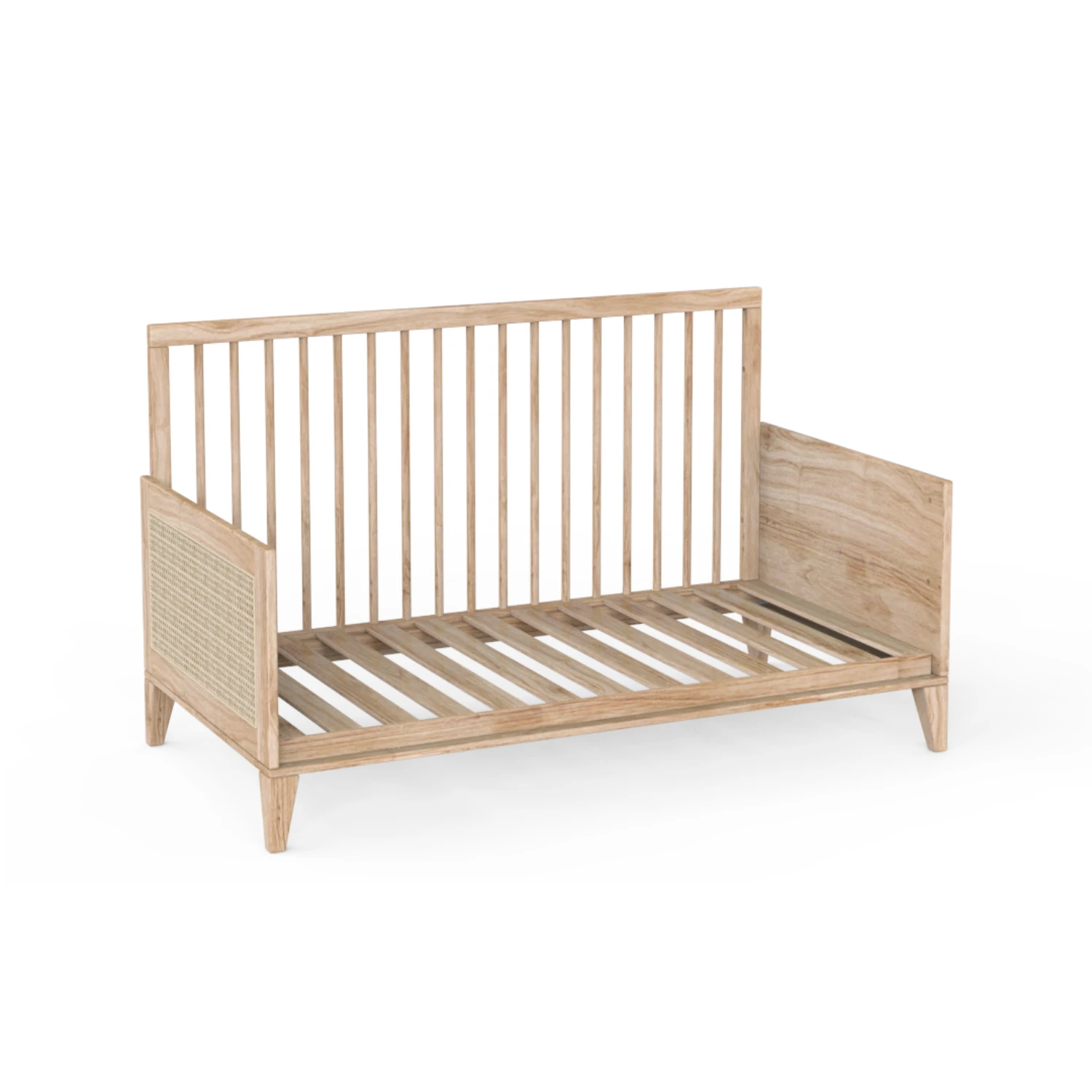 Łóżeczko dziecięce NAMI BOIS wykonane z prawdziwego drewna – lite drewno w konstrukcji oraz fornir drewniany na panelach – emanuje naturalnym zapachem drewna, bez sztucznych imitacji. W połączeniu z naturalnymi rattanowymi frontami jeszcze bardziej przybliża do natury i harmonii, jaką ona daje. Funkcjonalność:- Trzy poziomy wysokości stelaża (wysoki, średni, niski), dostosowane do wieku dziecka.- Możliwość przekształcenia w małą sofę – wystarczy zdjąć jedną ściankę, by łóżko mogło dalej służyć w pokoju dziecka.