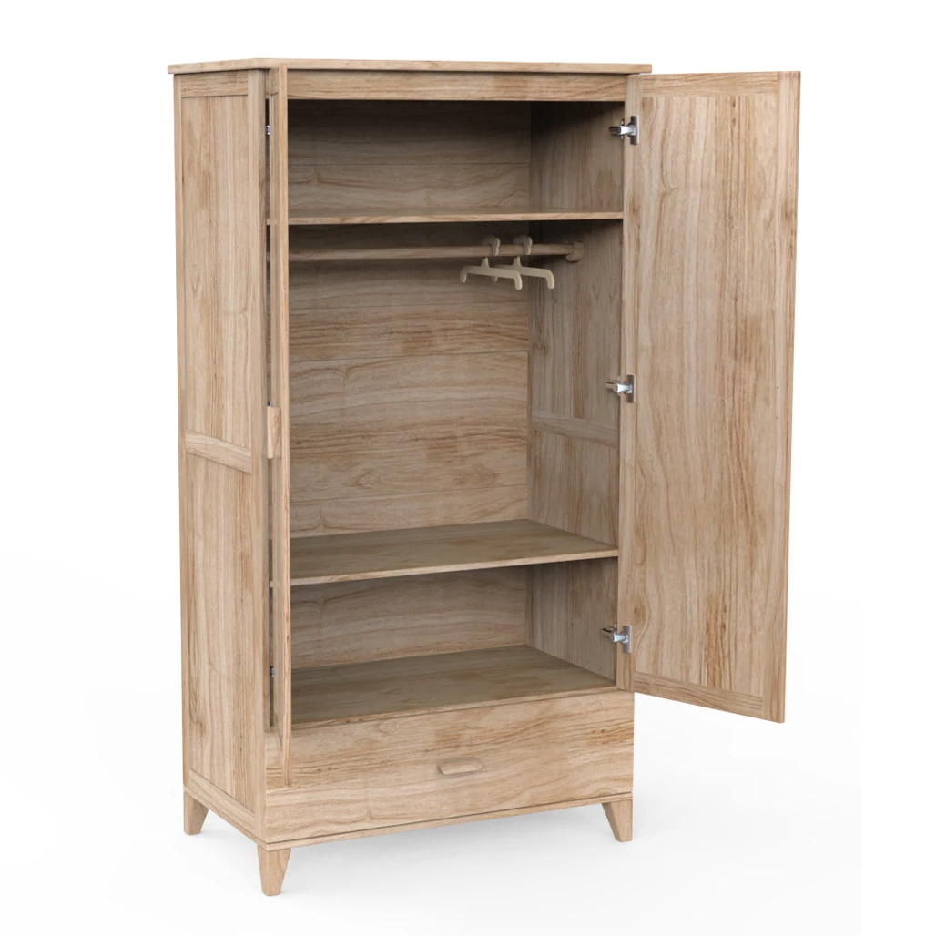 Szafa Naïa Bois została stworzona z myślą o miłośnikach natury. Wykonana z prawdziwego drewna – litego na wybranych elementach oraz fornirowanego na panelach – emanuje naturalnym pięknem i zapachem drewna, bez sztucznych imitacji. Trudno o bliższy kontakt z naturą i dobrostan, jaki zapewnia. Za jej dwiema dużymi drzwiami, zamontowanymi na zawiasach z cichym domykiem, kryją się dwie przestrzenie na wieszaki oraz pięć półek, zapewniając mnóstwo miejsca na wszystkie rzeczy maluszka.