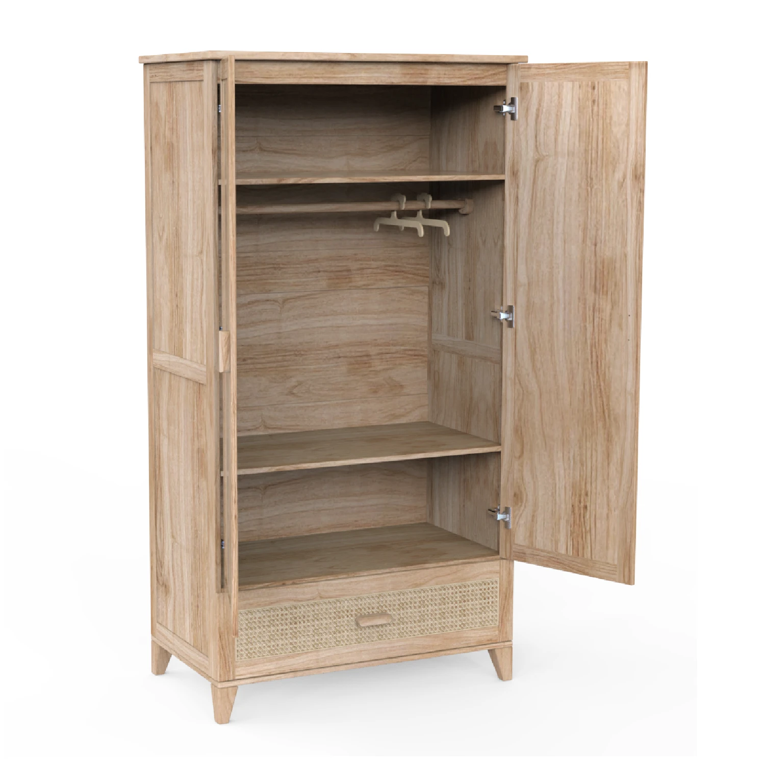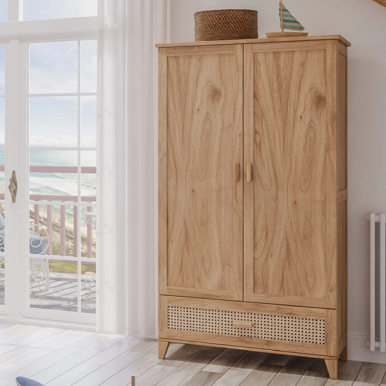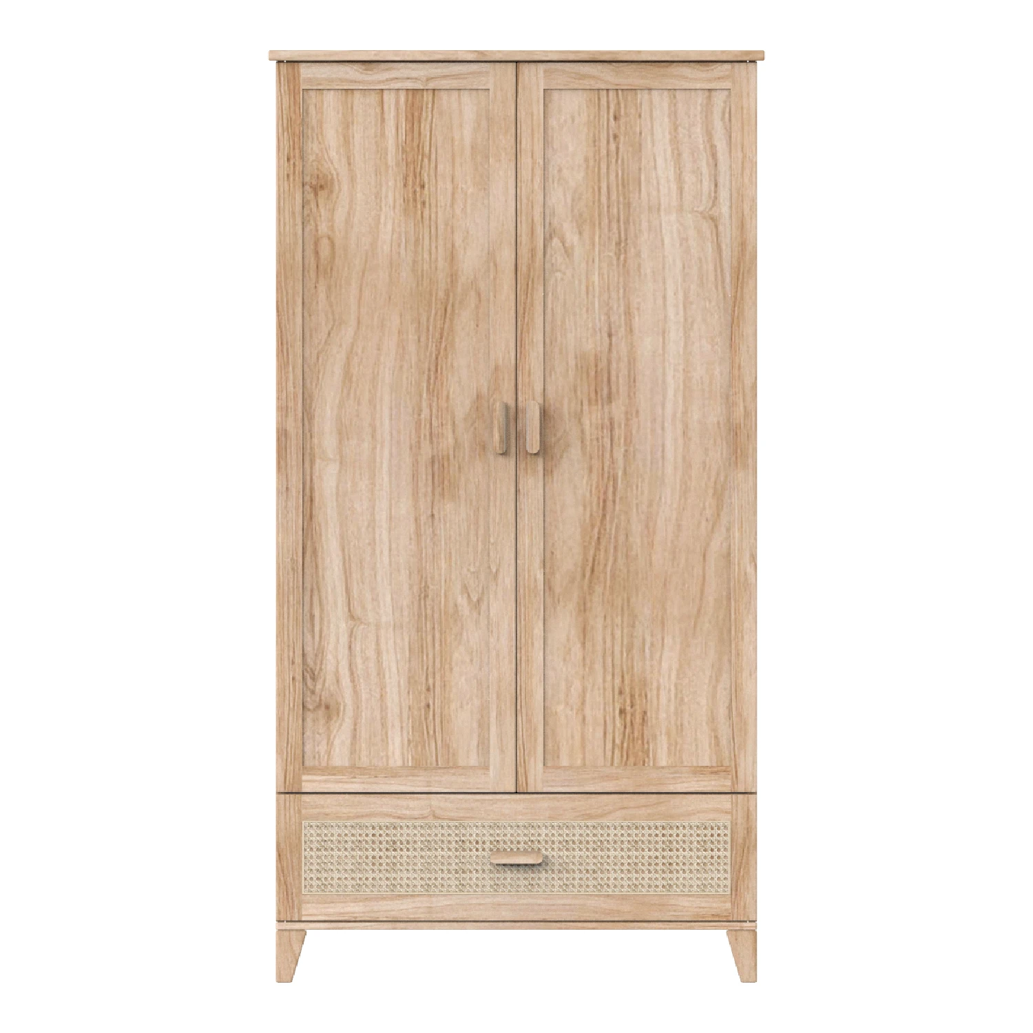 Dodaj nowoczesnej elegancji do pokoju swojego dziecka dzięki szafie NAMI BOIS. Jej unikalny design łączy naturalnie pleciony rattan z solidnym drewnem, tworząc współczesny i stylowy wygląd. Szafa posiada dwoje drzwi z drążkiem na ubrania i półkami, a także praktyczną szufladę zapewniającą uporządkowaną przestrzeń do przechowywania. Dodatkowo w zestawie znajdują się dwa wieszaki Théo.
