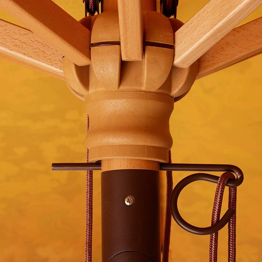Elegancki parasol patio Flourish z drewna bukowego i poliestru. Solidna, regulowana konstrukcja, odporna na warunki atmosferyczne. Retro wzór, głęboki brąz i dekoracyjne frędzle. Łatwy w montażu i przechowywaniu.