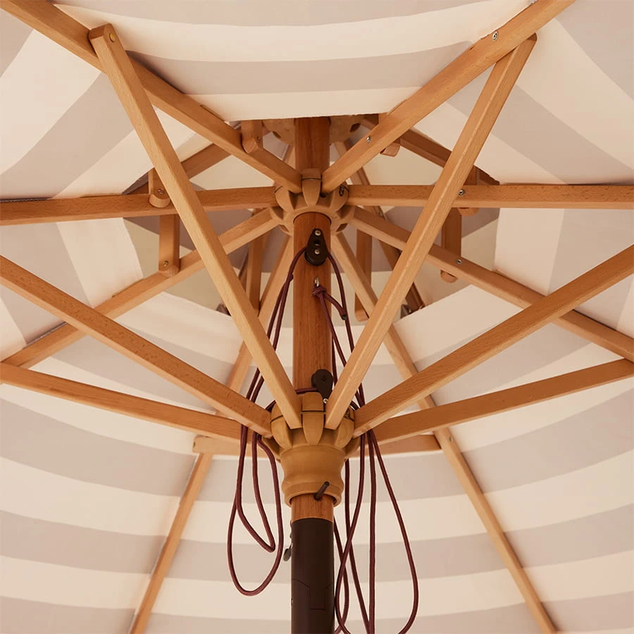 Elegancki parasol ogrodowy w paski stracciatella, wykonany z trwałego poliestru i drewna. Odporny na warunki atmosferyczne, z płynnym mechanizmem i stabilną konstrukcją. Stylowy dodatek do każdej przestrzeni.