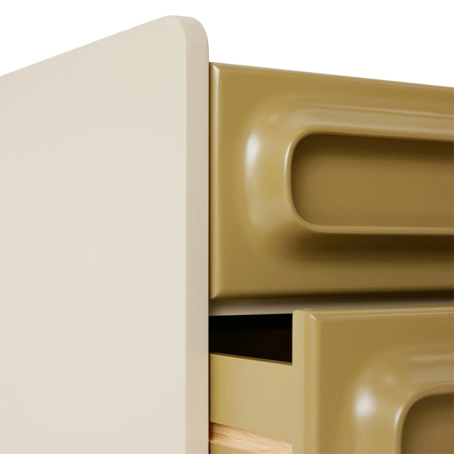 Szafka nocna SPACE wyróżnia się nie tylko estetyką, ale także funkcjonalnością. Wyposażona w pojemne szuflady, pozwala schować drobiazgi, takie jak książki, okulary czy kosmetyki, zachowując minimalistyczny wygląd pomieszczenia. Zielono-kremowa kolorystyka nadaje jej uniwersalny charakter, dzięki czemu łatwo dopasujesz ją do różnych aranżacji – od nowoczesnych po retro. Wykonana z wysokiej jakości MDF, jest odporna na uszkodzenia, a jej wykończenie podkreśla dbałość o detale. To mebel, który łączy w sobie praktyczność i design, tworząc harmonijną całość w Twojej sypialni.