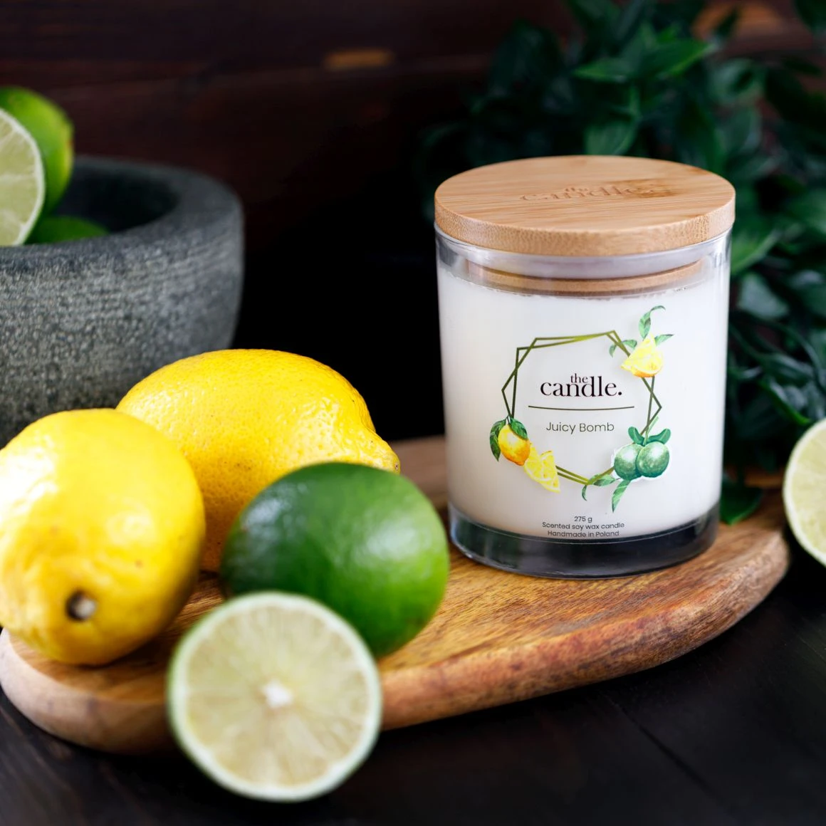 Juicy Bomb to ręcznie wykonana świeca sojowa, bazująca na ekologicznym i certyfikowanym wosku sojowym. W środku szeroki drewniany knot, dzięki któremu wosk spala się równomiernie. Świeca nie dymi, nie pozostawia sadzy na ściankach. produkt ekologiczny, bezpieczny, nietestowany na zwierzętach.