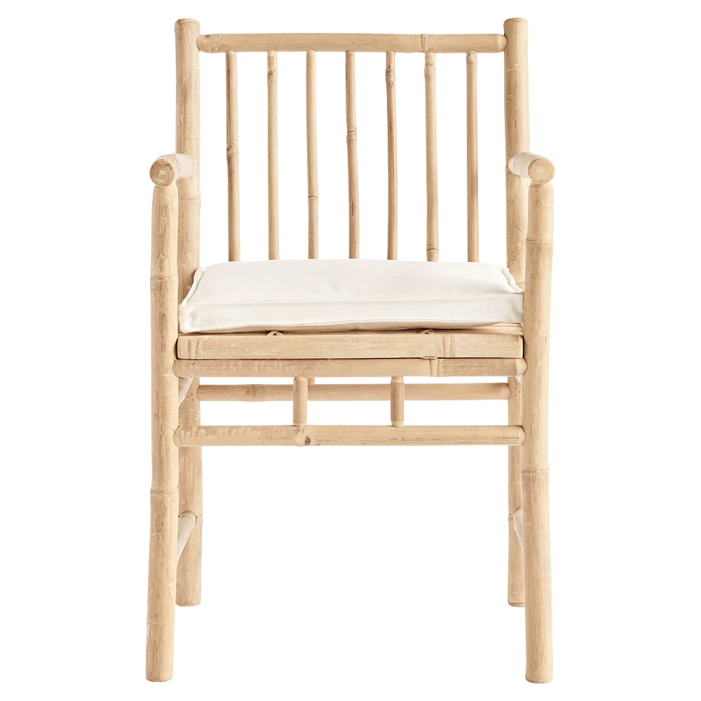 Bambusowy krzesło Tine K Home wykonana jest ręcznie, więc każdy egzemplarz jest unikalny. Schemat jednak jest ten sam - długie i grube poziome belki, cienkie i krótkie pionowe. Bambus jest jednym z najtwardszych materiałów, pochodzących z rodziny roślin drzewiastych. Fotel zatem jest świetnym wyborem do salonu, altany czy na taras. Zwłaszcza że w zestawie są także wygodne siedzisko w białym kolorze